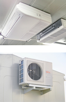 Модуль подстанции предусматривает работу в режиме кондиционирования от встроенного кондиционера (охлаждение и подогрев воздуха без конденсации влаги). Наружный блок кондиционера устанавливается снаружи на узкой стороне модуля, внутренний блок устанавливается на потолке отсека распределительных устройств.