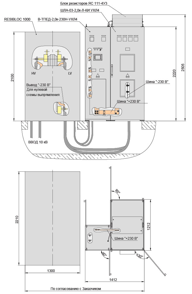 с трансформатором RESIBLOC 1000, преобразовательной секцией В-ТПЕД-2,0к-230Н УХЛ4, с одним шкафом линейных автоматов. Присоединение - кабелями. Шкаф линейных автоматов с двухсторонним обслуживанием.